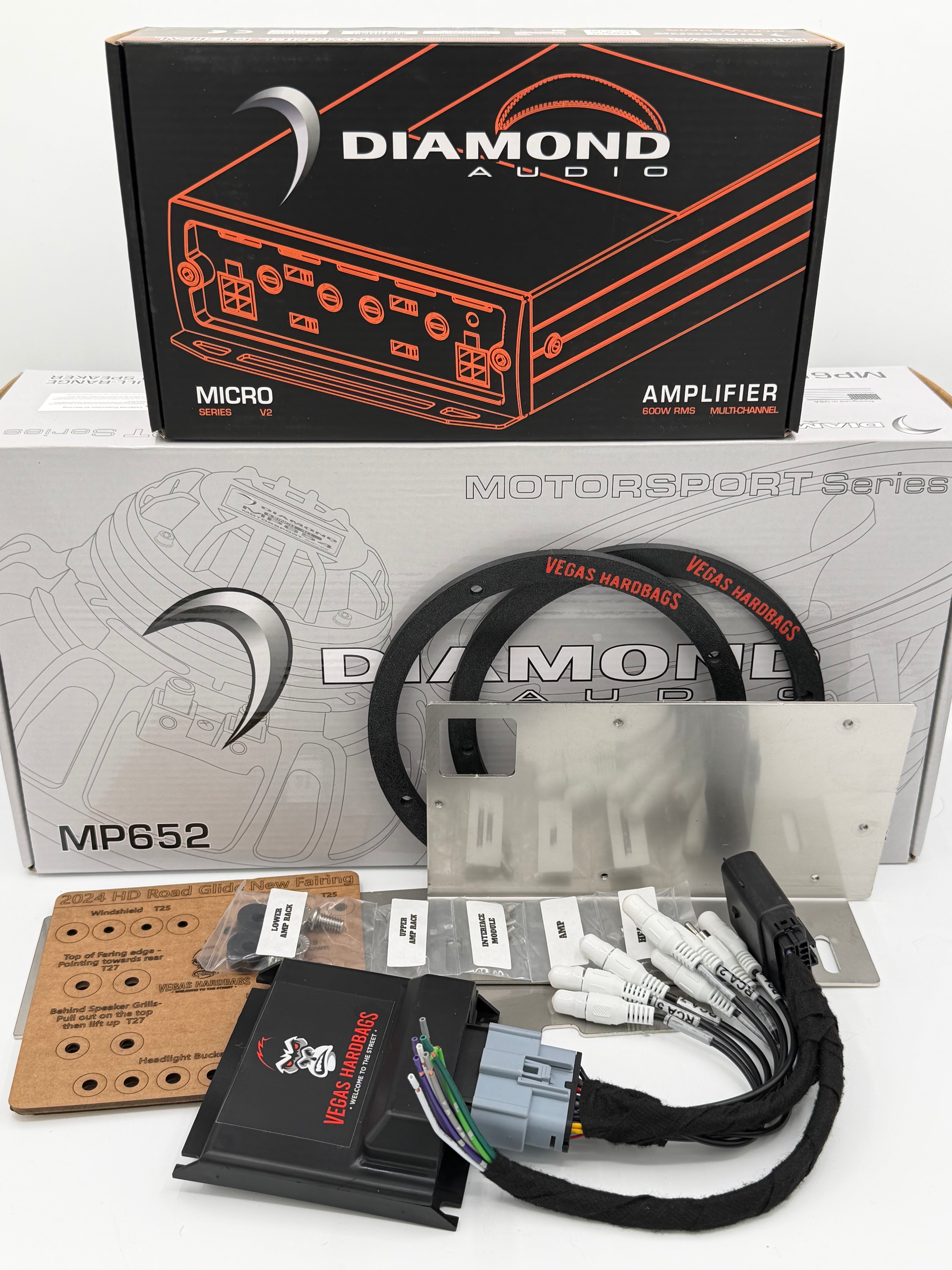 Vegas Hardbags’ Signature Fairing System turns your ride into a rolling sound machine. At its core are the legendary Diamond Audio MP692 horn coax speakers, delivering razor-sharp clarity at speed, powered by the relentless force of the Diamond Audio Micro 4 amplifier. Bonus: two additional channels are available for future upgrades.